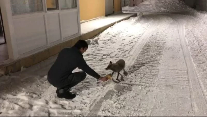 Şantiye çalışanları anne tilki ve yavrusunu elleriyle besliyor