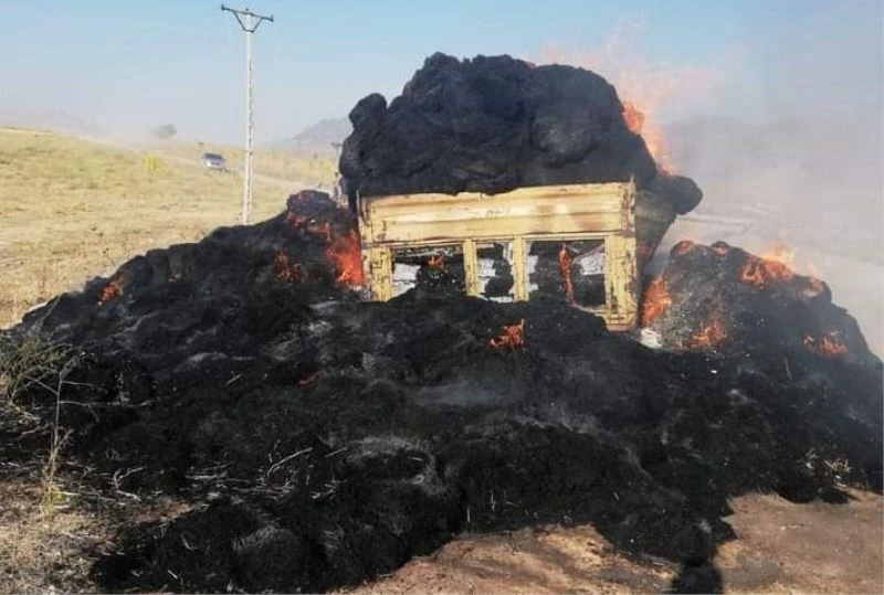 Karaman’da elektrik tellerine temas eden sap balyası yüklü römorklar çıkan yangında kullanılamaz hale geldi.