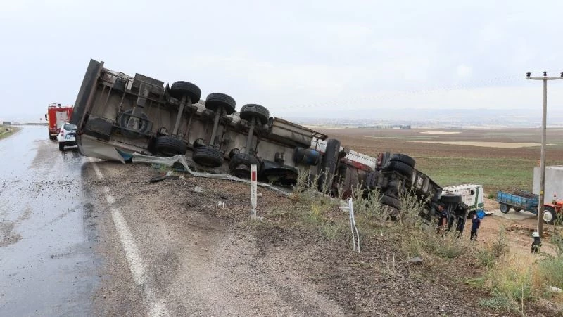 Aksaray’da yoldaki mazottan kayan ve şarampole devrilen tırın sürücüsü kazayı burnu bile kanamadan atlattı.