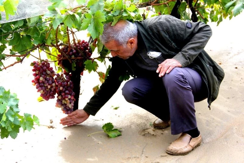 Manisa’nın Sarıgöl ilçesinde dün akşam saatlerinde etkili olan şiddetli yağmur ve dolu nedeniyle sergide kurutulmaya bırakılan üzümlerde zarara neden oldu.