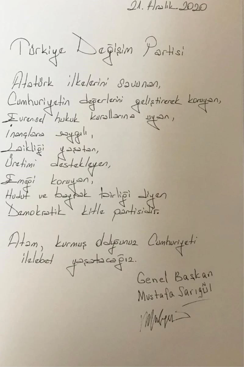 “Türkiye Değişim Partisi Atatürk ilkelerini savunan, Cumhuriyetin değerlerini geliştirerek koruyan, Evrensel hukuk kurallarına uyan, İnançlara saygılı, Laikliği yaşatan, Üretimi destekleyen, Emeği koruyan, Hudut ve bayrak birliği diyen Demokratik kitle partisidir. Atam kurmuş olduğunuz Cumhuriyeti ilelebet yaşatacağız."