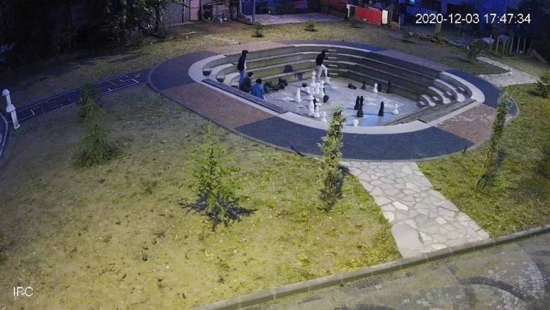 Satranç alanına zarar veren gençler güvenlik kamerasında