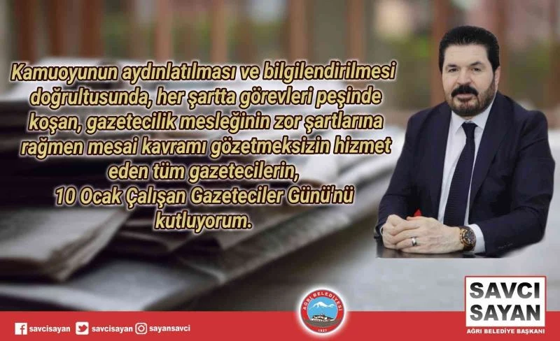 Ağrı Belediye Başkanı Savcı Sayan, 10 Ocak Çalışan Gazeteciler Günü dolayısıyla bir mesaj yayımladı.