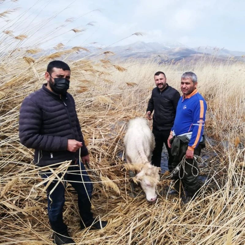 Van’ın İpekyolu ilçesinde sazlık alanda mahsur kalan büyükbaş hayvanlar kurtarıldı.