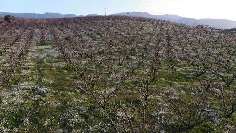 Aydın’da bahalar aylarının gelmesi ile meyve bahçeleri çiçek açarken, papatyalarla kaplı şeftali bahçelerinde oluşan görsel şölen mest etti.