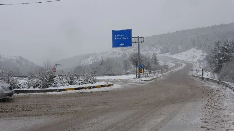 Karabük’ün Safranbolu ilçesinde, yüksek kesimlerde etkili olan kar yağışı nedeniyle Karabük-Bartın karayolu beyaza büründü.