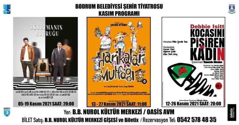 Bodrum Belediyesi Şehir Tiyatrosu Kasım ayı programı da açıklandı. Program şu şekilde; 05 Kasım 2021 Cuma Saat: 20.00 Uçurtmanın Kuyruğu, 12 Kasım 2021 Cuma Saat: 20.00 Kocasını Pişiren Kadın, 13 Kasım 2021 Cumartesi Saat: 11.00 Harikalar Mutfağı, 19 Kasım 2021 Cuma: Saat: 20.00 Uçurtmanın Kuyruğu, 26 Kasım 2021 Cuma Saat: 20.00 Kocasını Pişiren Kadın, 27 Kasım 2021 Cumartesi Saat: 11.00 Harikalar Mutfağı.