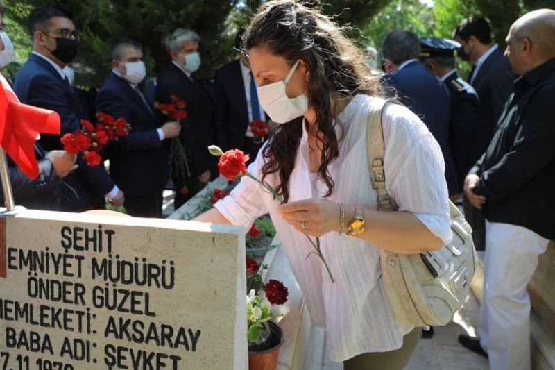 Aksaray Şehitliğinde Vali Hamza Aydoğdu ve Belediye Başkanı Evren Dinçer’in çelenk sunumu ile saygı duruşunda bulunulması ve İstiklal Marşının okunmasıyla başlayan törende 15 Temmuz 2016’da gerçekleştirilen hain darbe girişiminde şehit olan Polis Özel Harekat Şube Müdürü Önder Güzel ve tüm şehitler yakınlarının da katılımıyla mezarı başında anıldı. Kur’an-ı kerim tilaveti ve dua edilen törende Vali Hamza Aydoğdu ve Belediye Başkanı Evren Dinçer, Şehit Önder Güzel’in eşi ve çocuklarıyla birlikte kabrine karanfil bıraktı. Aileye baş sağlığında bulunan heyet mezarı başında dua ederek ayrıldı.