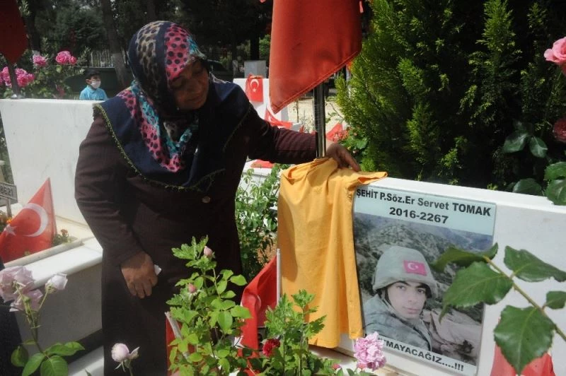 Ramazan bayramı öncesinde evladının mezarını ziyaret eden bir şehit annesi gözyaşları içinde oğluna aldığı bayramlığı mezar taşına sardı.