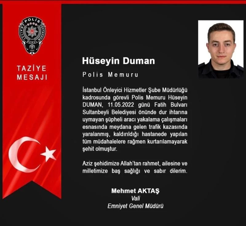 Sultanbeyli’de kaçan aracı kovalayan yunus timinin hafriyat kamyonuyla çarpışması sonucu şehit olan polis memuru Hüseyin Duman’ın Bursa’da yaşadığı ve 1 ay önce evlendiği öğrenildi. Şehit polis memuru, Ordu’da toprağa verilecek.