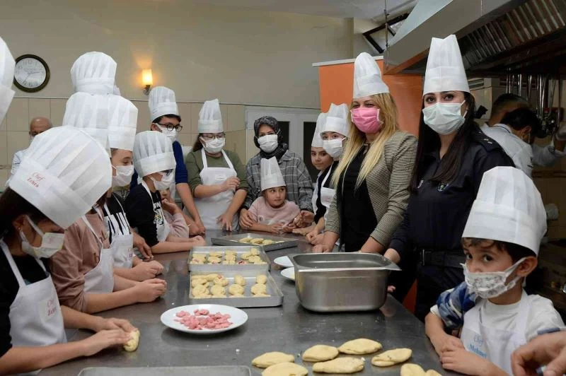 Aşçılar şehit çocuklarına poğaça, kek ve makarna yapımlarını gösterdi. Şehit çocukları usta aşçıların mutfağından çıkan yemekleri yeme imkanı buldu.