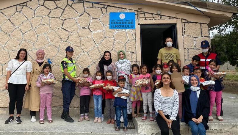 Adıyaman’ın Kahta ilçesinin Erikdere Köyü okulunda öğrencilerle bir araya gelen Adıyamanlı Şehit Jandarma Uzman Çavuş Ayhan Yanık’ın eşi Beyhan Yanık, Adıyamanlı Nazlıcan Uçar, Seval İlhan ve Nuray Şahin, kırtasiye ve oyuncak yardımında bulundu. Köy okulu öğrencileriyle bir araya gelen gençlere, Kahta ilçe Jandarma Komutanlığı ekipleri de eşlik etti.
