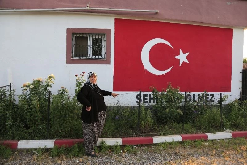 Osmaniye’nin Toprakkale ilçesi Sazlık Mahallesindeki evin duvarı 6 metrekare ebadında kırmızı beyaz renklerle Türk bayrağı şeklinde boyanan, altına da “Şehitler ölmez, vatan bölünmez” yazılan şehit Uzman Çavuş İbrahim Etiz’in baba ocağı, mahalleye gelen herkes tarafından hemen fark ediliyor.