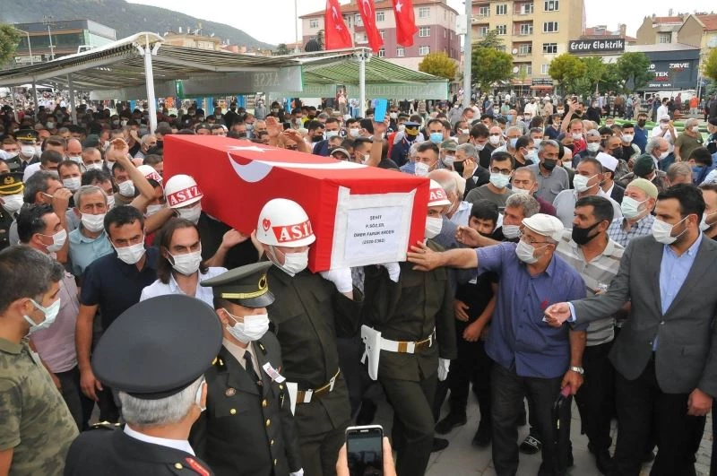 Pençe-Şimşek operasyon bölgesinde teröristlerin taciz ateşi sonucu yaralanan Piyade Sözleşmeli Er Ömer Faruk Erdem, kaldırıldığı hastanede şehit oldu. Şehidin cenazesi dün memleketi Konya’nın Akşehir ilçesine getirildi. Şehit Ömer Faruk Erdem için Akşehir Nasreddin Hoca Meydanı’nda cenaze töreni düzenlendi. Cenaze töreni öncesi Hazine ve Maliye Bakan Yardımcısı Mehmet Hamdi Yıldırım, AK Parti Konya Milletvekili Orhan Erdem, Konya Valisi Vahdettin Özkan, Akşehir Belediye Başkanı Salih Akkaya, şehidin babaannesi, kardeşleri ve yakınlarına başsağlığı dileğinde bulundu. Konya İl Müftüsü Ali Öge’nin kıldırdığı cenaze namazı sonrası omuzlara alınan şehit Piyade Sözleşmeli Er Ömer Faruk Erdem’in naaşı Akşehir Şehitliğinde defnedildi. Şehit Ömer Faruk Erdem’in cenazesinde şehidin Babaannesi Döndü Erdem, kız kardeşleri Tuğba, Navruz, Sevgi ve Fadime gözyaşlarına hakim olamadı. Şehit Piyade Sözleşmeli Er Ömer Faruk Erdem’in babası Metin ve annesi Nesibe Erdem’in daha önce vefat ettiği öğrenildi. İlk görev yeri Şırnak’ın Uludere ilçesine bağlı Gülyazı köyünde 1 yıldır görev yapan ve 10 gün önce memleketine izne geldiği öğrenildi.
