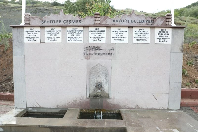“Akyurt’umuzun şehitlerimize olan saygısını göstermek için yıllar önce bu çeşme inşa edildi. Burası Kalecik, Çankırı, Kırıkkale ve kuzey illerimize giden bir yol. Buradan geçen herkes çeşmemizi kullanır, burada soluklanır. Yıllar içerisinde meydana gelen yıpranmanın sonucunda çeşmemize müdahale ettik. Çevresiyle birlikte yeniden dizayn ettiğimiz mekanda çalışmalarımız hemen hemen tamamlandı. Akyurt’un terörle mücadelede verdiği şehitlerin isimlerinin yazılı olduğu çeşmemizi insanlarımız özenle kullanarak geleceğe taşıyacaklar. Yolcular burada durakladıklarında oturup vakit geçirmek için kamelyalarımızı kullanacak. Kamelyalarımızda oturup suyundan içecek, şehitlerimizin ruhlarına bir Fatiha okuyacak. Düzenleme çalışmalarımızın hayırlı olmasını diliyor, bu vesileyle tüm şehitlerimizi rahmet ve şükranla anıyorum.”