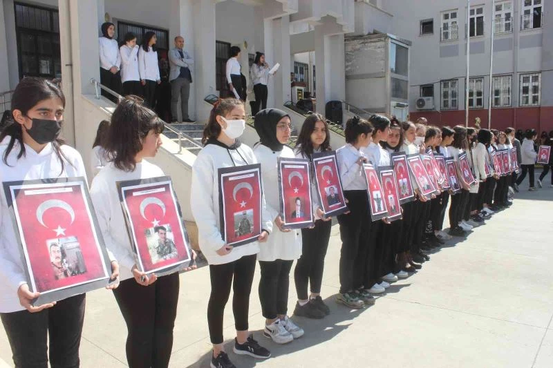 Adıyaman Mehmet Akif Ersoy Ortaokulu öğrencileri, 18 Mart Şehitleri Anma Günü ve Çanakkale Deniz Zaferi’nin 107. Yıl Dönümünü nedeniyle düzenlenen programda şehitlerin çerçeve içerisindeki fotoğraflarını taşıdı.