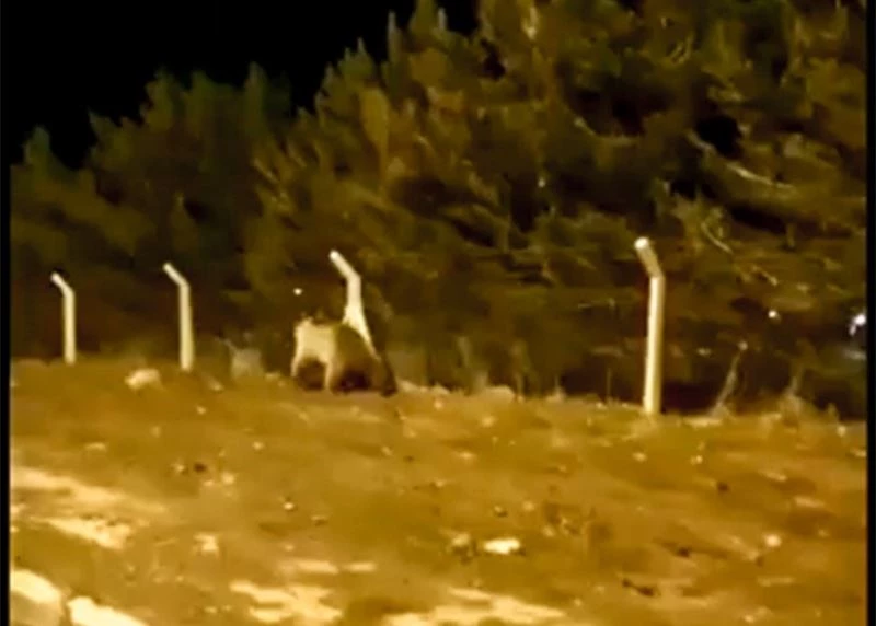 Tel örgüyle kaplanan yol kenarında yiyecek arayan boz ayı uzun bir süre görüntülenmesine aldırış etmeden arayışını sürdürdü. Yol boyunca yiyecek arayan ayı daha sonra giderek gözden kayboldu.