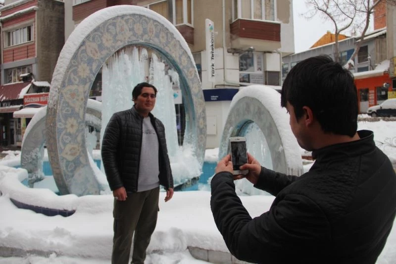 Vatandaşlar, buz sarkıntılarının oluştuğu havuzun önünde hatıra fotoğrafı çektirmeye de ihmal etmiyor.