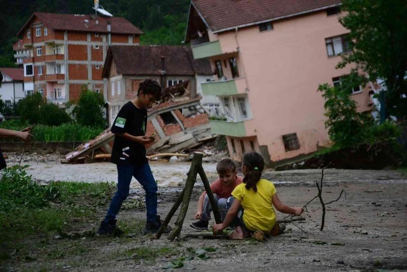 Sel bölgesinde derenin taşması neticesinde yıkılan evlerde kalan çocuklar ailelerinin bulunduğu yerde çocukluklarını yaşıyor. Arkadaşlarıyla oyun oynayan 7 yaşındaki Seyit Efe Abaoğlu, “Pembe ev bizimdi, yıkıldı. Yanındaki ev ise tamamen yıkılmış. Evimizde havuz vardı o da yıkılmış. Burada da oyun oynuyorum arkadaşlarımla” derken 12 yaşındaki Ulaç Yaser Abaoğlu, “Sel felaketi olduğu için havuzumuz gitti, evimiz gitti, anılarımız gitti. Kardeşlerimle bu alanda oyun oynuyoruz. Annemler bizi teselli ediyor. Benim yıkılan evde çocukluğum geçti. Evimiz gittiği için üzülüyorum” diye konuştu.