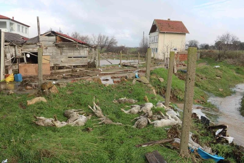 Edirne’nin Enez ilçesinde sel sularının şiddetine dayanamayan ahırın duvarları yıkıldı. Ahırda bulunan onlarca hayvan telef oldu.