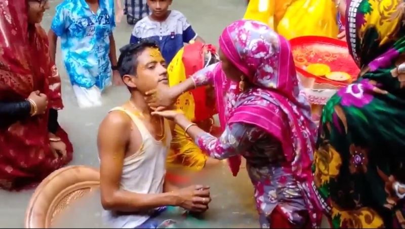 Bangladeş’te son 3 aydır devam eden Muson yağmurları ülke genelinde birçok yerde sele neden oldu. Yaklaşık 360 nehrin bulunduğu ülkenin birçok şehrinde nehir suları tehlike noktasını aşarak yaşam alanlarına girdi. Meydana gelen sel nedeniyle bölgedeki vatandaşlar günlerdir evde hapis hayatı yaşayarak oldukça zor günler geçiriyor. Sel sebebi ile günlerdir dışarıya çıkamayan insanlar, nikah, düğün, cenaze gibi toplu törenleri de yapamıyor. Ülkenin güney bölgesinde yer alan Bengal Körfezi’nin yanında yaşayan bir çifte ise sel suları engel olamadı. Çift, bel seviyesine çıkan sel sularının içinde kına törenlerini gerçekleştirdi. Yaşam alanlarına sel suyunun girmesi sebebiyle kına kutlamasını sürekli erteleyen çift, en sonunda aldıkları kararla suyun içine sandalyeler yerleştirip oturdu ve kına törenlerini yaptı. Henüz isimleri bilinmeyen ancak suda yaptıkları kınayı sosyal medyada paylaşan çift, çok sayıda tebrik mesajı aldı. Çiftin kına merasimine akraba ve komşuları da katıldı.