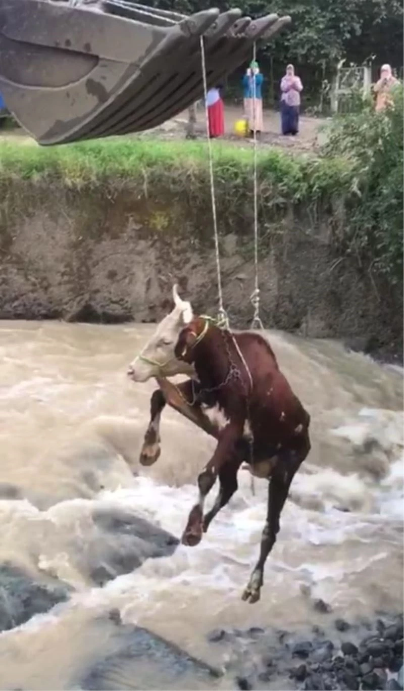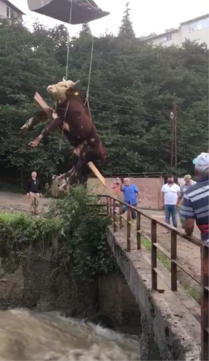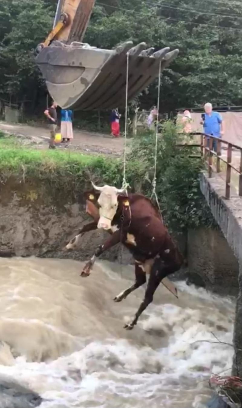 Selden en fazla zarar gören yerler arasında yer alan Giresun merkeze bağlı Çaldağ beldesi Orhaniye köyünde dere yatağında çaresiz bir şekilde görülen inek çevredeki bir iş makinesinin kepçesine bağlanan iple bulunduğu yerden kurtarıldı. İp ve tahta yardımı ile ineğin kayarak azgın dere sularına düşmemesi için uğraş verilirken, inek kepçe yardımı ile kurtarılıp sahibine teslim edildi.