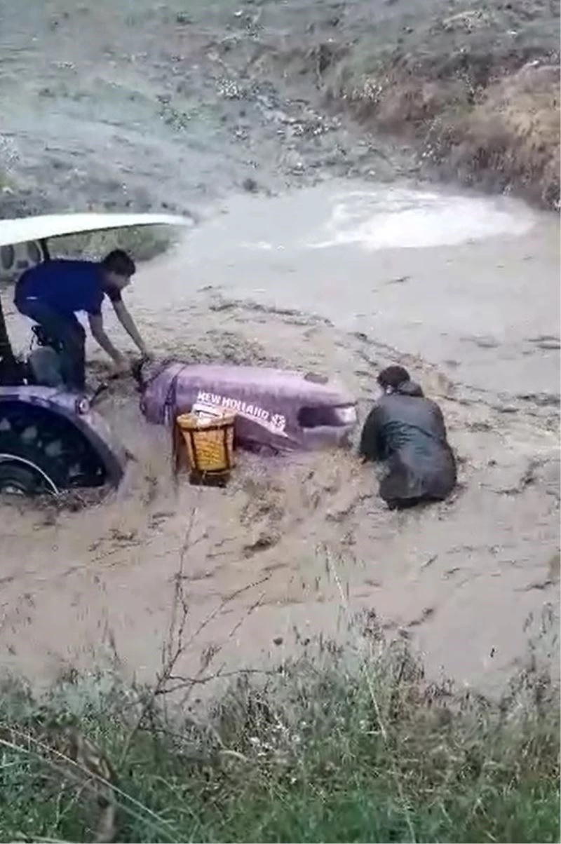 Denizli’de yağışın etkisiyle debisi yükselen çayda sele kapılan traktörü kurtarmak isteyen sürücü, ne yapsa da başarılı olamadı. Yardıma rağmen sürüklenmeyene başlayan traktörden atlamayı başaran sürücü, kendini son anda kurtardı.