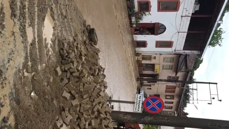Bursa’nın Mudanya ilçesine bağlı Trilye Mahallesi’nde etkili olan sağanak yağış sonucu ev, iş yerleri ve bir okul sular altında kaldı, kaldırım taşları ise yerinden söküldü.