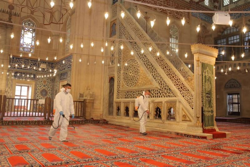 Korona virüs salgını nedeni ile 16 Mart 2020 tarihinde ibadete kapatılan ve 29 Mayıs Cuma günü ibadete açılacak olan camilerin dezenfekte etme işlemleri ilk olarak Edirne’nin simgesi olan Selimiye Camii’nden başlandı.