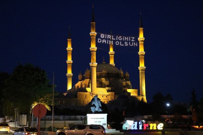 Fetullahçı Terör Örgütü’nün (FETÖ) 15 Temmuz’daki hain darbe girişiminin 4. yıl dönümde, Edirne’de tarihi Selimiye Cami’ne, ‘Birliğimiz daim olsun’ mahyası asıldı. Selimiye Cami’nde gün boyu okunan Kur’an-ı Kerim ve Mevlidi Şerif akabinde Akşam Ezanının ardından mahya yandı. 2 büyük heybetli minaresi arasına, 15 Temmuz anısına ‘Birliğimiz daim olsun’ yazısı görseli, görenlere duygu dolu anlar yaşattı. Öte yandan, Atatürk Anıtı önünde gece boyunca anma etkinlikleri il protokolü ve halkın katılımıyla devam etti.