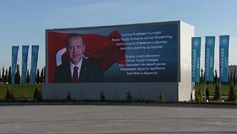Erdoğan’ın indiği Semerkant Havalimanı’nda bir duvara "Türkiye Cumhurbaşkanı Recep Tayyip Erdoğan Zat-ı Devletlerinin misafirperver Özbekistan diyarına teşriflerini içtenlikle kutluyoruz" yazısıyla birlikte Erdoğan’ın fotoğrafı yansıtıldı.