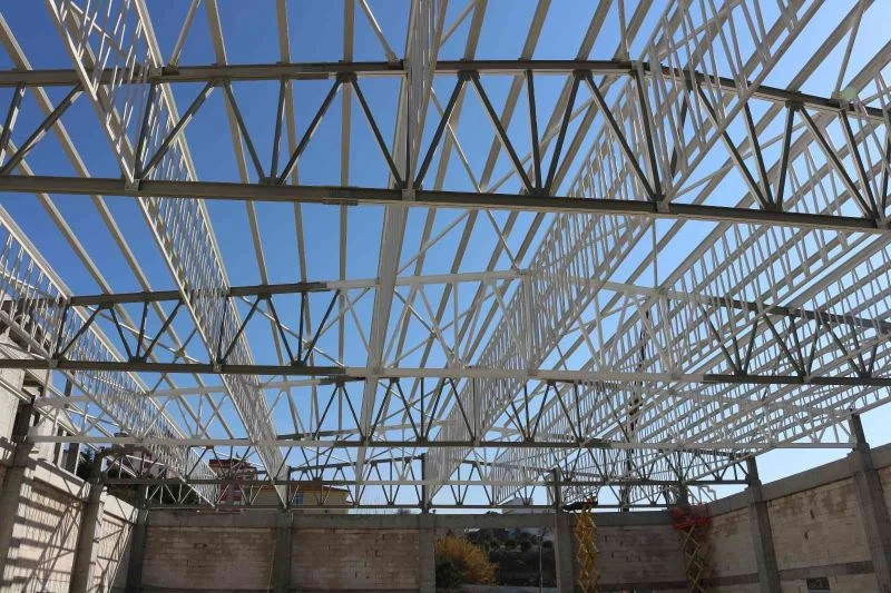 Antalya Büyükşehir Belediyesi tarafından Serik Kongre ve Kültür Merkezi bünyesinde yürütülen düğün salonu inşaatı hızla devam ediyor. Çatı çelik imalatlarının tamamlandığı projede çatı kaplama imalatlarına geçildi.