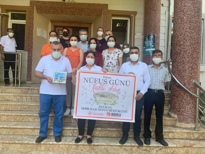 11 Temmuz Dünya Nüfus Günü dolayısıyla, İlçe Nüfus ve Vatandaşlık Müdürü Hatice Tümer çalışanları ile birlikte Hükümet Konağı önünde özel yaptırılan afişle fotoğraf çektirerek günlerini kutladı.