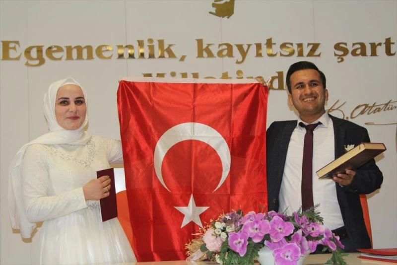 Nikahı kıyılan çiftlere Türk Bayrağı ve Kuran-ı Kerim hediye edildi.