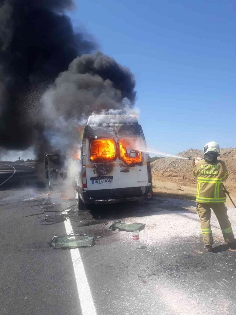 Balıkesir’de seyir halindeyken aniden alev alan servis aracı kullanılamaz hale geldi.