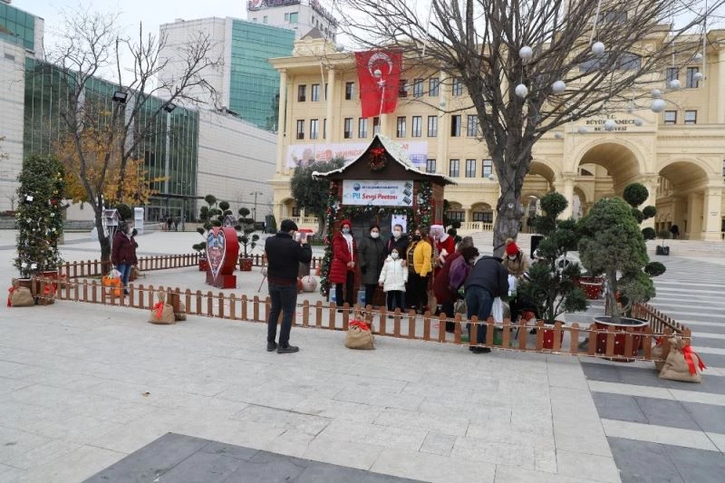 Uzaktaki sevdiklerine yeni yıl dileklerini kartpostal ile iletmek isteyenler belediye meydanında kurulan “Sevgi Postanesi”ni ziyaret ederek ücretsiz kartpostal ve pul alabiliyor.