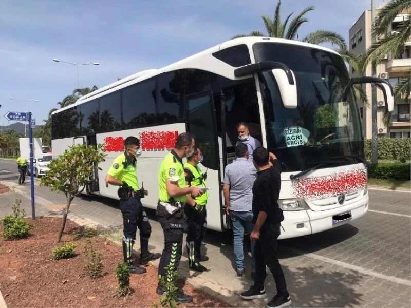 Korona virüs ile mücadele kapsamında arttırılan denetim çalışmaları kapsamında Marmaris İlçe Emniyet Müdürlüğü’ne bağlı Asayiş Büro ve Trafik Tescil Şube Amirliği ekipleri genel yol denetimleri yaptığı sırada yeni Datça yolunda, Datça’dan hareket edip Ağrı’ya gidecek olan bir şehirlerarası yolcu otobüsünü durdurdu. Evrak ve yolcu denetimi yapan ekipler, 6 yolcunun seyahat izin belgesi almadığını, 9 yolcunun da biletsiz olduğunu tespit etti. Araç içinde seyahat izin belgesi olmayan 6 şahsa sokağa çıkma kısıtlamasını ihlalden gerekli tutanak tutularak otobüsten valizleri ile indirildi. Şehirler arası otobüs seyahat acentesine de seyahat izin belgesi olmadan yolcu taşımaktan, biletsiz yolcu almaktan, terminaller ve duraklar harici yolcu indirip-bindirmekten cezai işlemler uygulandı.