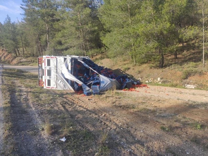 Muğla’nın Seydikemer ilçesinde domates yüklü kamyon devrilirken, sürücü kazadan yara almadan kurtuldu.
