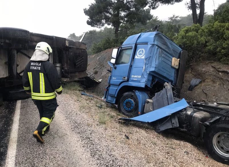 Muğla’nın Seydikemer ilçesinde yağış nedeniyle kayganlaşan zeminde kamyon ve TIR kaza yaptı. Araç içinde sıkışan TIR şoförü itfaiye ekiplerince kurtarıldı.