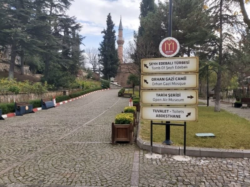 Osmanlı Devletinin kurucu Osman Gazi’nin kayınpederi, devletin manevi kurucu olan Şeyh Edebali Türbesi’ni günde binlerce kişi ziyaret ederken, tarihi bölge pandemi ve kısıtlamalar ardından sessizliğe büründü. Yerleşke içinde bulunan 1332 yılında yapılan tarihi Orhangazi Camii bugün Cuma namazı için gelen vatandaşlarla bir nebze olsun hareketlilik yaşanırken, türbenin kısıtlama sürecinde kapısının kilitli olduğu görüldü. Cuma namazına gelen vatandaşlar Şeyh Edebali Türbesine çıkarak türbe dışından dua okurken, bu sürecin geçmesini temenni ettiler.