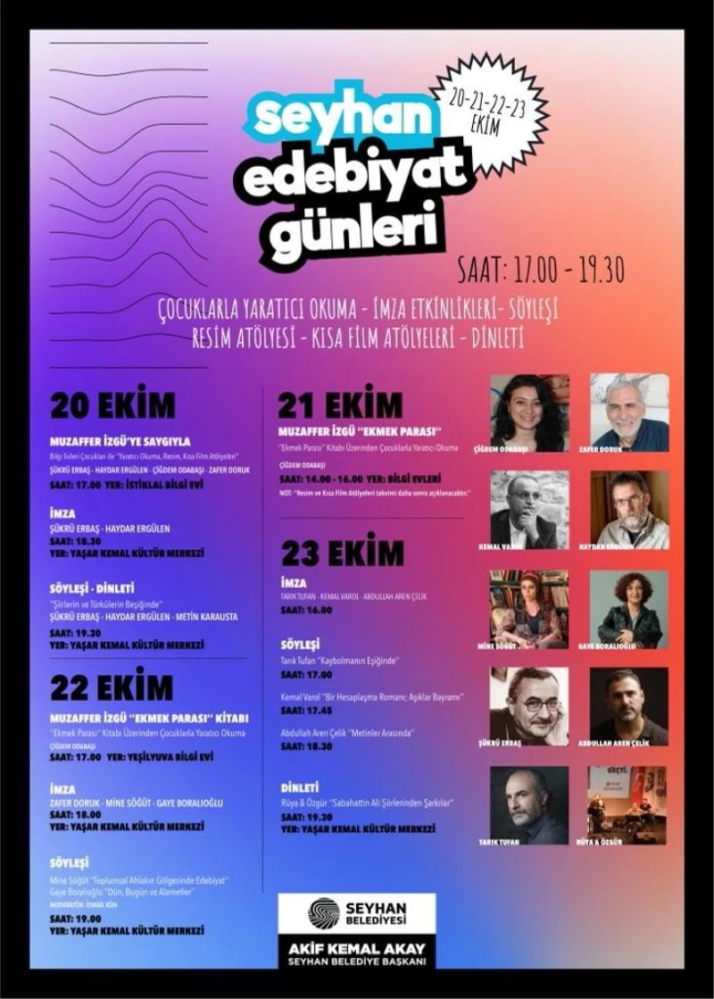 Seyhan Belediyesi’nin düzenlediği “Edebiyat Günleri” 20 Ekim Çarşamba günü başlıyor. Teması, Adana’nın yetiştirdiği büyük edebiyatçı Muzaffer İzgü’nün “Ekmek Parası” adlı eseri olan edebiyat etkinliklerinde, söyleşiler, dinletiler, okuma atölyeleri, imza etkinlikleri, resim ve kısa film atölyeleri gerçekleştirilecek.