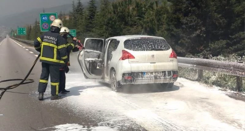 Kocaeli’nin Körfez ilçesi TEM otoyolunda seyir halinde motor bölümünden alevler yükselen otomobil, yanarak hurdaya döndü.