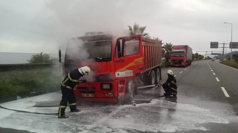 Seyir halinde lastiği yanmaya başlayan kamyona itfaiye ekipleri müdahale etti