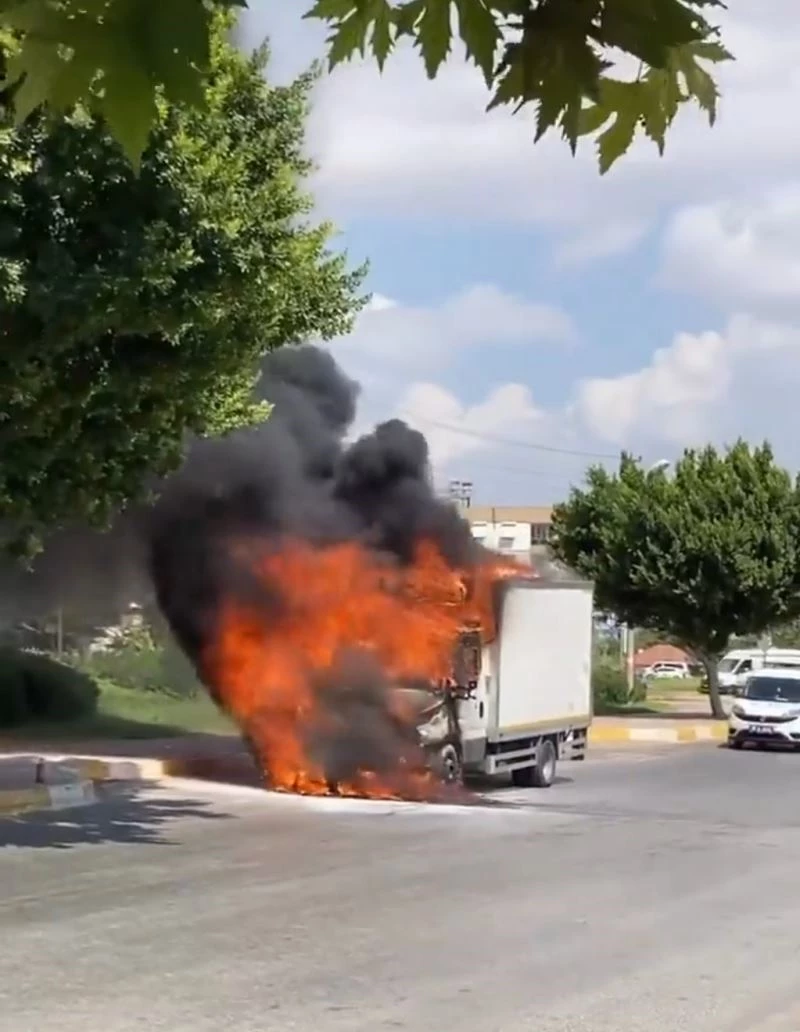 Antalya’da kapalı kasa kamyonette çıkan yangında kamyonetin motor bölümü kullanılamaz hale geldi.