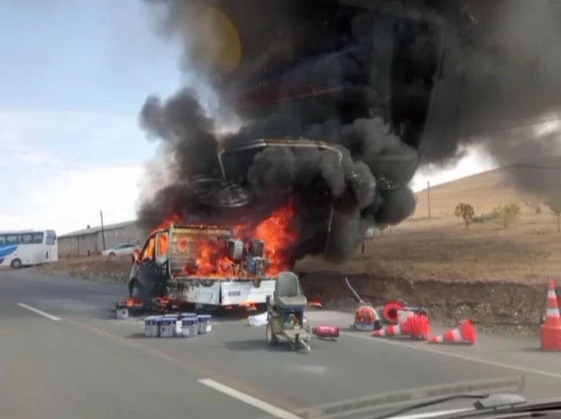 Van-Erciş karayolunda seyir halinde olan boya yüklü kamyonet alev alev yandı.