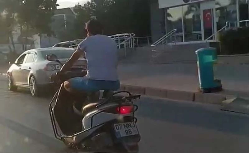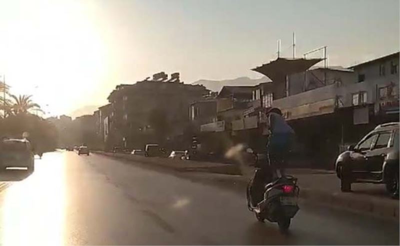 Antalya’nın Alanya ilçesinde motosiklet üzerinde kasksız olarak ayakta seyreden genç, canını hiçe sayarak trafiği tehlikeye soktu.