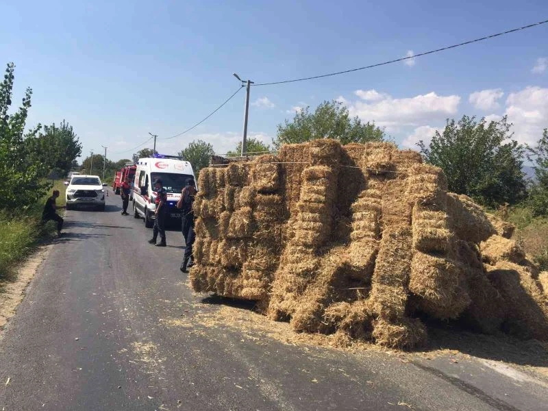 Seyir halindeki saman kamyonu devrildi, sürücüyü itfaiye kurtardı