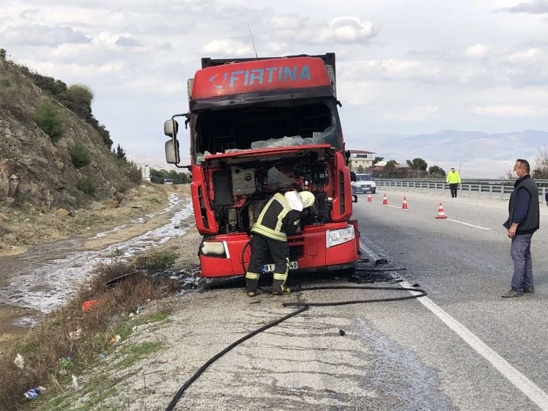 Alaşehir-Buldan karayolunun Sarıgöl Selimiye Mahallesi Kabakçılar mevkisinde rampa yukarı çıkarken bilinmeyen nedenle tır alev aldı.