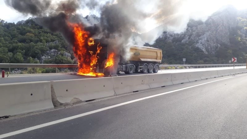 Antalya’da seyir halindeki bir tır aniden alev aldı, sürücüsü olaydan yara almadan kurtuldu.