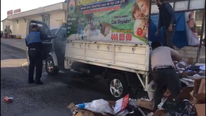 Seyir halindeyken yangın çıkan geri dönüşüm toplama aracını zabıta söndürdü